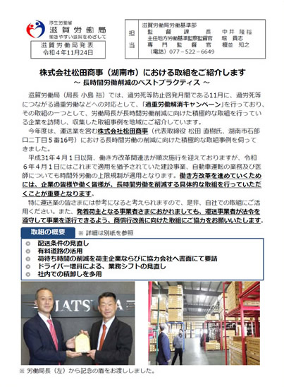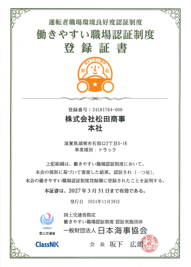 松田商事は、自動車運送事業者の「働きやすい職場認証制度」を取得し、従業員が安心して長く働ける職場環境の整備に積極的に取り組んでいます。